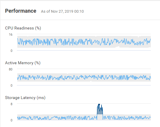 You can view all required performance charts for virtual machine in single view. Additionally CloudIQ performance charts will highlight any performance anomalies during the last 24 hours. In below example you can see that for selected virtual machine storage response time was suddenly increased and went back to normal.