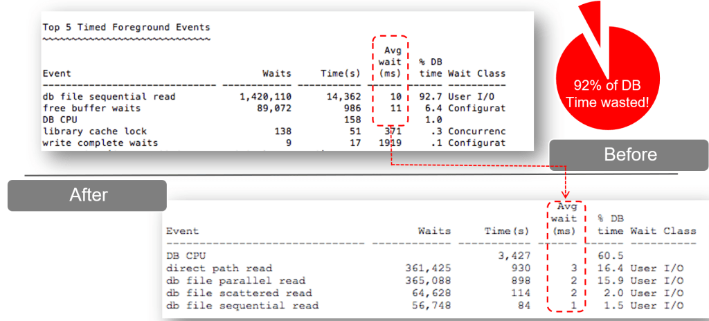 You can also see that performance troubleshooting is rated as second most time consuming activity, but the question is how to solve it. One of the ways people try to solve this is by upgrading their database stack. In below AWR example snippets you can see that how one of the customer has solved their performance issue by moving to DellEMC solution. Earlier they were having 92% User I/O wait time, which also means 92% of the time DB is waiting for database subsystem to respond.