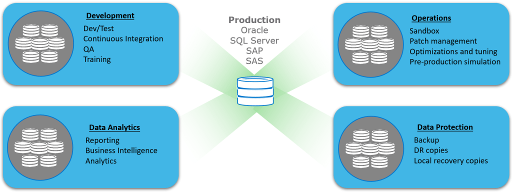 But the real problem is what do you do with those databases and data? Most businesses today are trying to keep more data online. This allows them to understand the patterns and anomalies using AI/ML, which helps them taking right decisions or course correction. All this is driven using copy data, which means you need actual source production database instances to analyze, test, develop etc. Below picture is the great depiction of multiple use cases which needs source database.