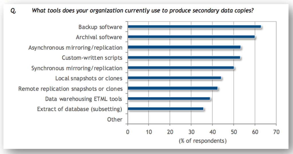 To which 62% of organizations, copies take ½ day or more to create (up to days). And this is very real as I have personally worked with one of my customer who used to take 2 ½ days to create single secondary copy starting weekend, on which 60 member developer team used to work.