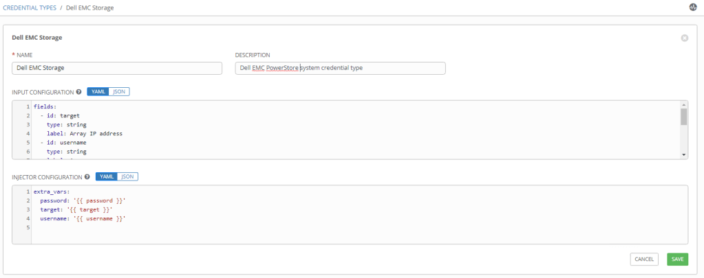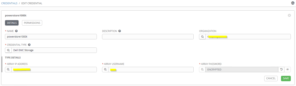 Once Dell Storage credential type is created then you can add PowerStore array details and credentials using AWX credential manager.