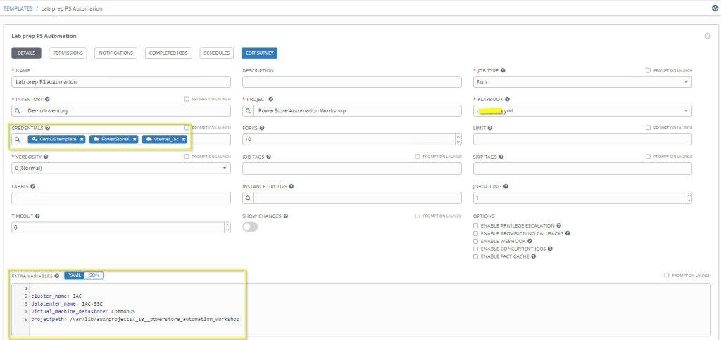 After adding PowerStore credential you can use the same in the AWX automation job template creation. Additional variables (like volume names, size, host etc.) can be captured using extra_vars