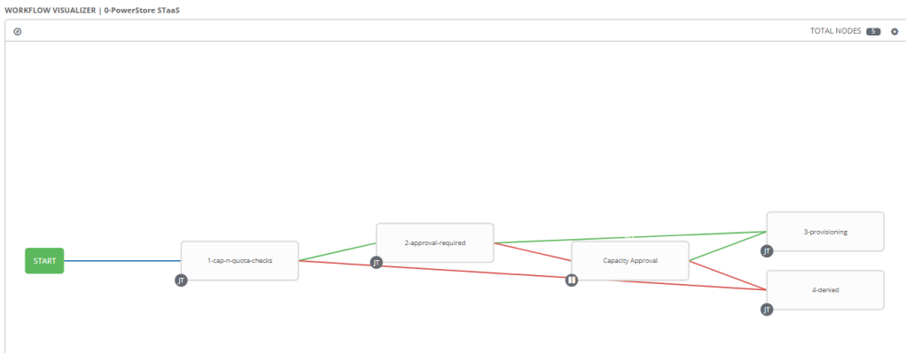 Additionally you can create survey to capture the required variables and also workflow visualizer to create multi-step breakdown of the automation tasks including but not limited storage automation. Below is the example of breaking down the storage provisioning workflow in the logical steps (like approval, quota management, provisioning, etc.)