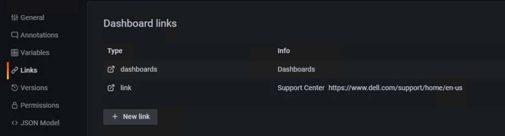 Then click on “Links” on the left and then “New Link”. Let’s create a link called “Dashboards”. The “Title” is the string that will be clickable. For “Type” we select “Dashboards”. If you only have a handful of dashboards they will all display in the same line. However if you are planning to have many, it’s better to tick the “Show as dropdown” checkbox to things neater.