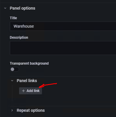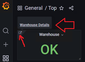 Once you have the URL you can go to the Top level dashboard and define a link on the “Warehouse” health stat panel. Then go to the Options section in the right pane and select “Panel links” and then “Add link”