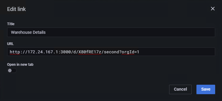 Here you can add a title for your link and the URL of the second level dashboard we save in the previous step. Optionally you can choose to open the second dashboard in a new tab. Click “Save” and get out of Edit mode