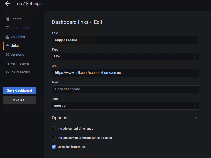 Considering this “Top” level dashboard is likely to show in an operations center, another use case would be to have handy some links related to support, such as an internal ticketing system, a vendor support site or a list of emergency contacts. Now let’s go ahead and create another link that links to the support page of a vendor so that we can open a service request. This time we will select the “Link” type and provide the URL to open when clicked. You can customize the link by selecting an “icon” that is meaningful for your use case. Notice how I have also force it to open the linked page in a “new tab” as we want our dashboard to remain open after we are done with the service request