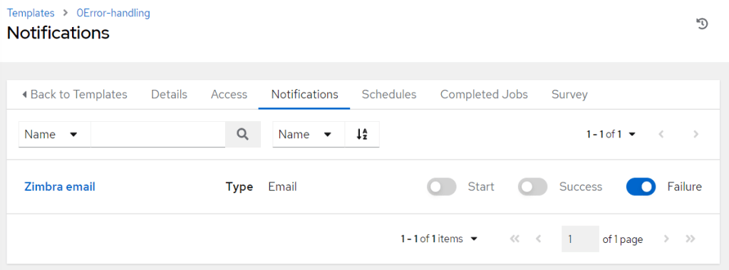 From the template we click in the “Notifications” tab. It will show you all the notifications you have configured. In my example “Zimbra email” is the only one. On the right side you will have the opportunity to enable any of the available notifications when the template starts, succeeds or fails. If you do the same thing for a “workflow template” it will show an additional slide button named “Approval”