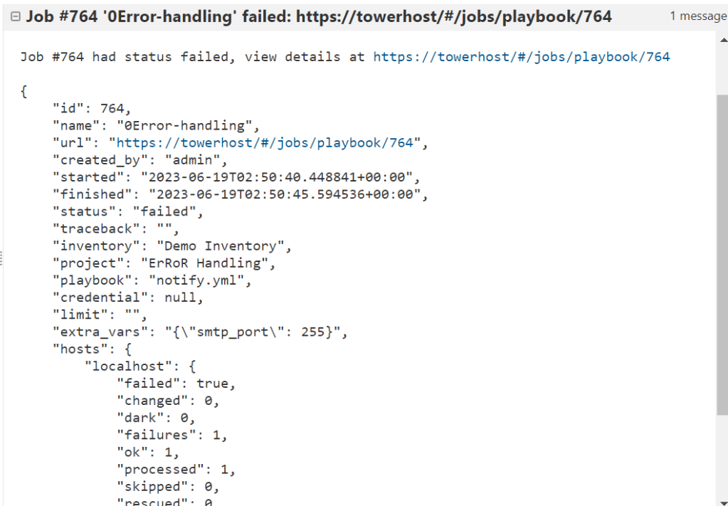 All is left to do is to run the template. When I run it fails as expected and I get an email in my Inbox with the following message. Notice how the body of the email maps to the syntax we saw in the “Customize messages” menu