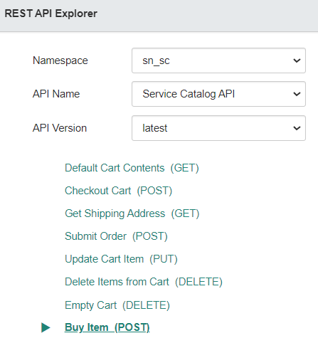 In the post about creating Incidents we covered the “REST API Explorer” tool in more detail. Please refer to that one if you are new to it. In this post we will use the “Service Catalog API“. In this screenshot you can see it is a very extensive API. It provides 47 API calls as of time of this writing.