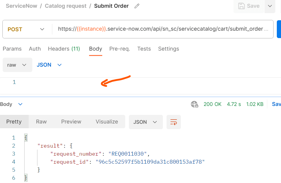 This API call is also part of the Postman collection you downloaded. As you can see in the screenshot below, even though this is a POST call, it doesn’t require a “Body” payload. If successful you should get a status code of 200 and the “Body” of the response will contain the “requests number”.